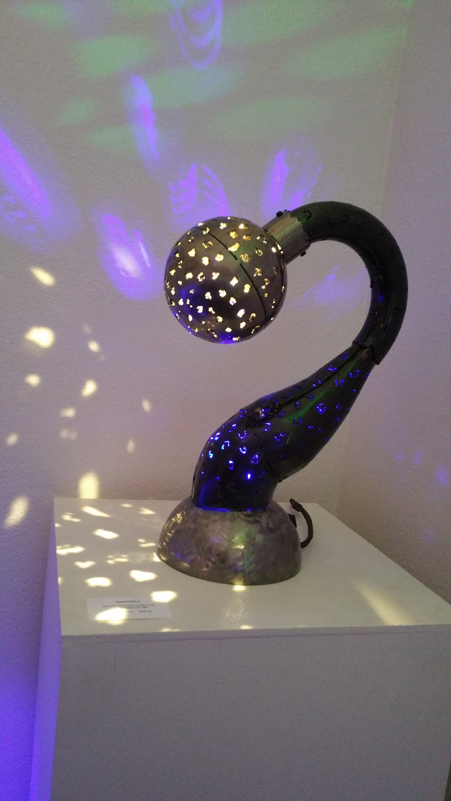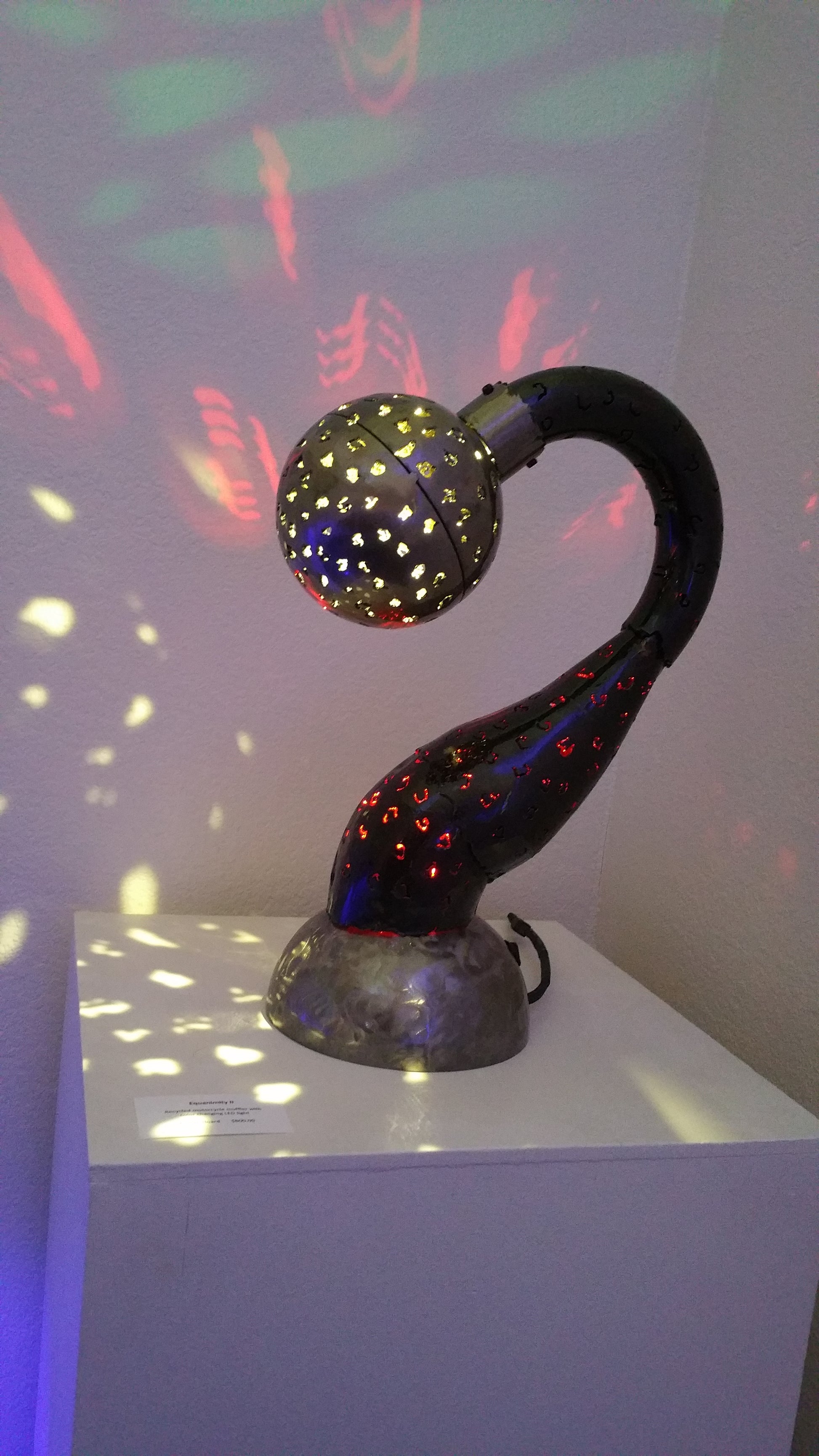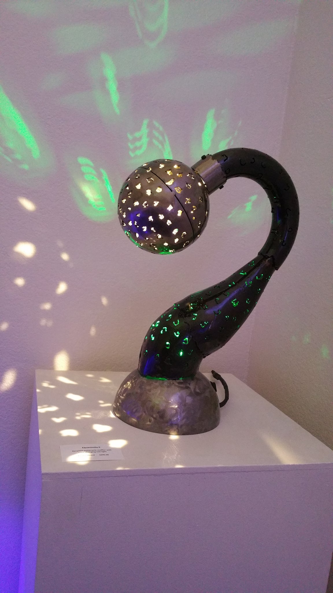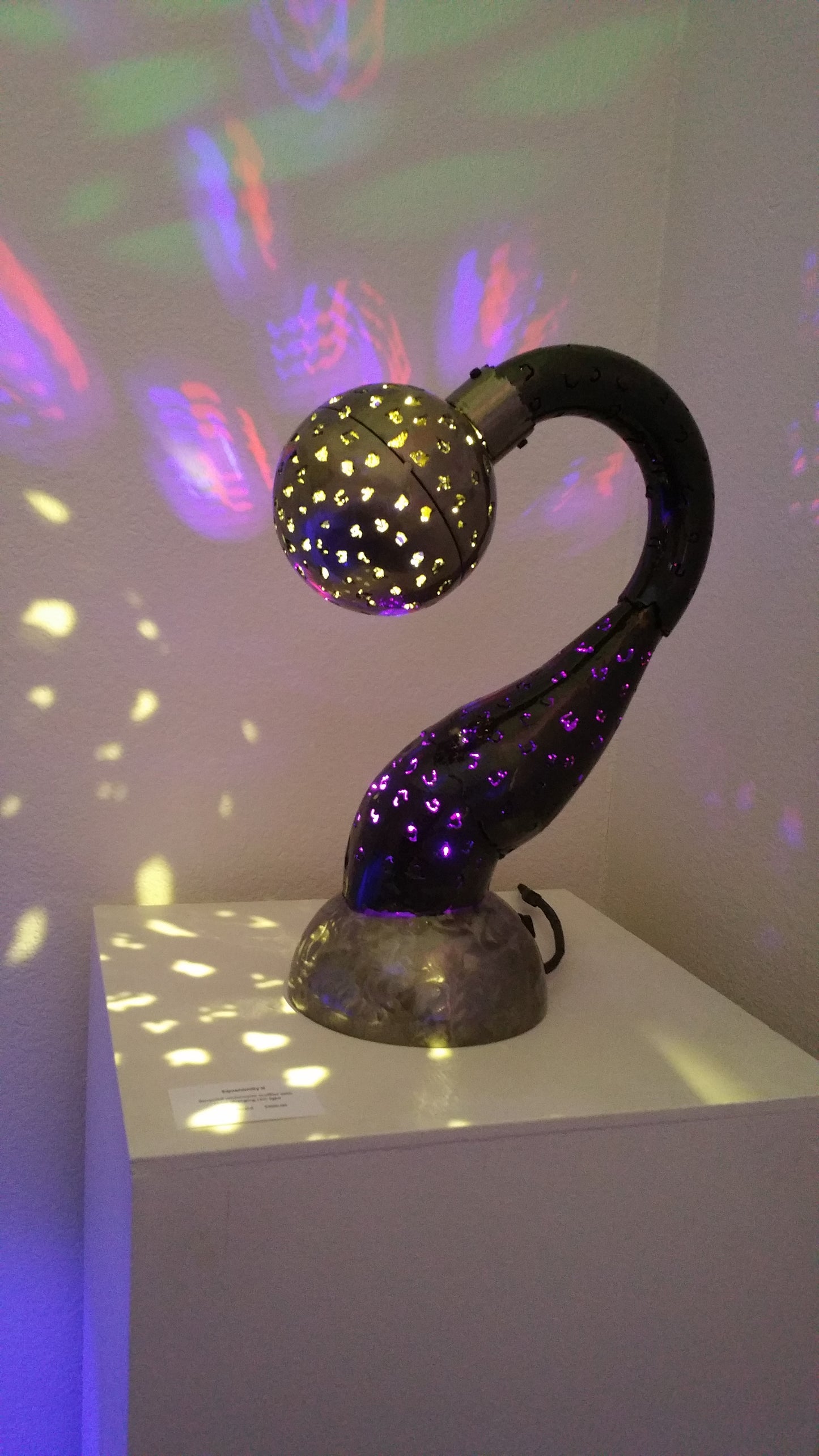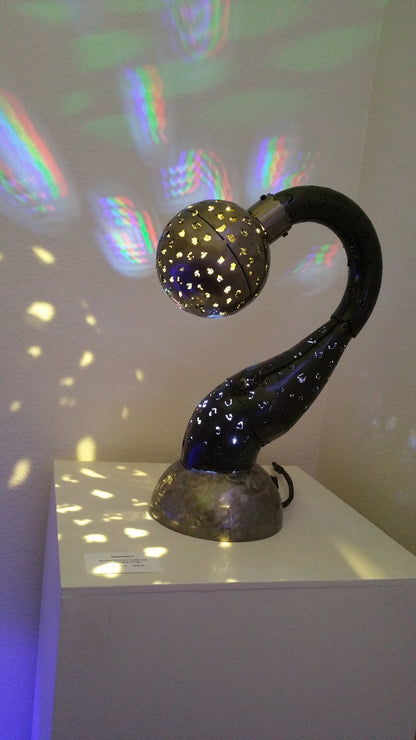 Created from a two stroke exhaust from a motorcycle. White light in the circle and color changing light in the base. Comes with remote control and can be plug-in or battery.