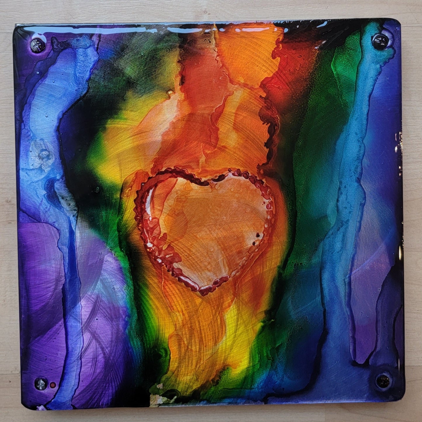 Made with rainbow of colors of alcohol ink on grinded aluminum with resin. Aluminum is screwed to wood panel.
