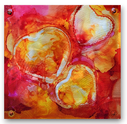 Made with blue, green and gold alcohol ink on grinded aluminum with resin. Aluminum is screwed to wood panel.