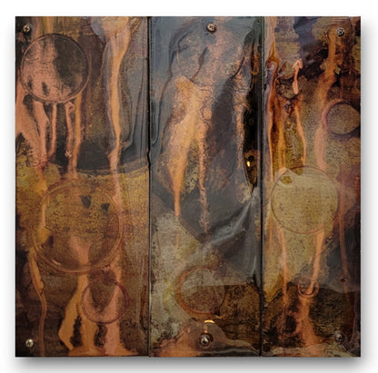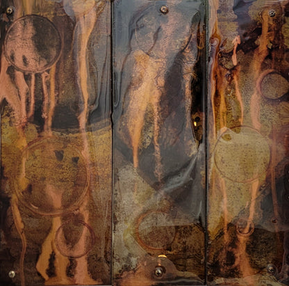 This 12 x 12 piece is made from recycled steel on a 3/4 wood panel. The steel is screwed to the wood panel... the steel as grinded patterns and alcohol ink. It is finished with a UV resin to protect the finish.