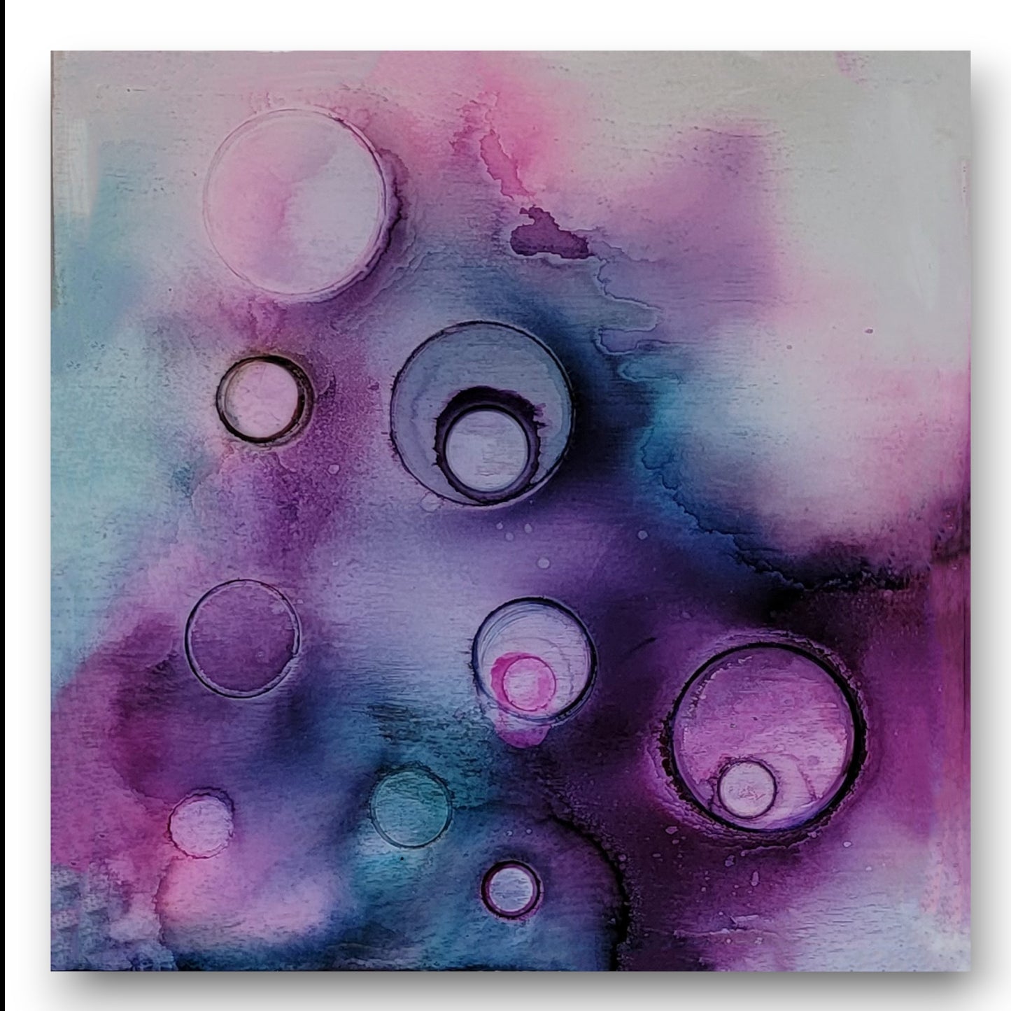 This 12 x 12 piece is made from recycled steel on a 3/4 wood panel. The steel is screwed to the wood panel... the steel as grinded patterns and alcohol ink. It is finished with a UV resin to protect the finish.