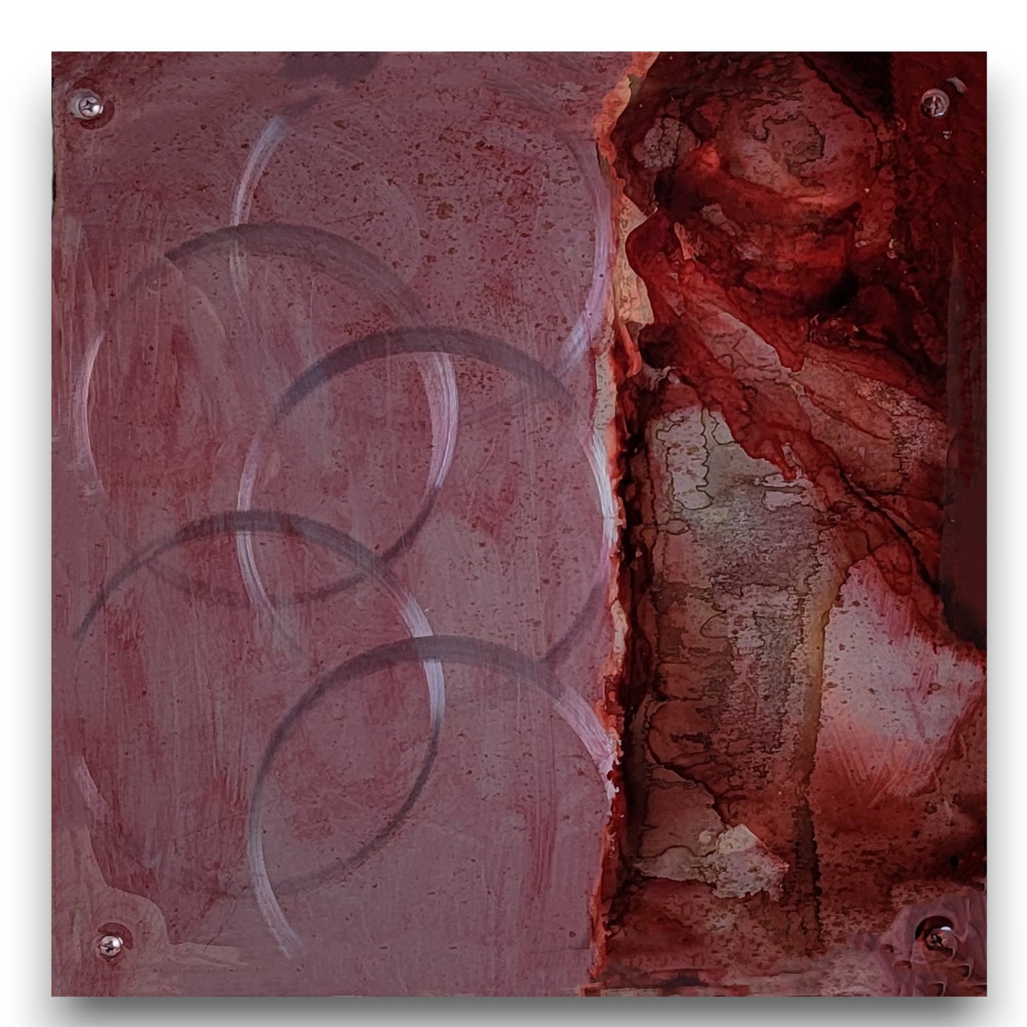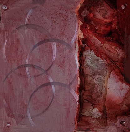 This 12 x 12 piece is made from recycled steel on a 3/4 wood panel. The steel is screwed to the wood panel... the steel as grinded patterns and alcohol ink. It is finished with a UV resin to protect the finish.
