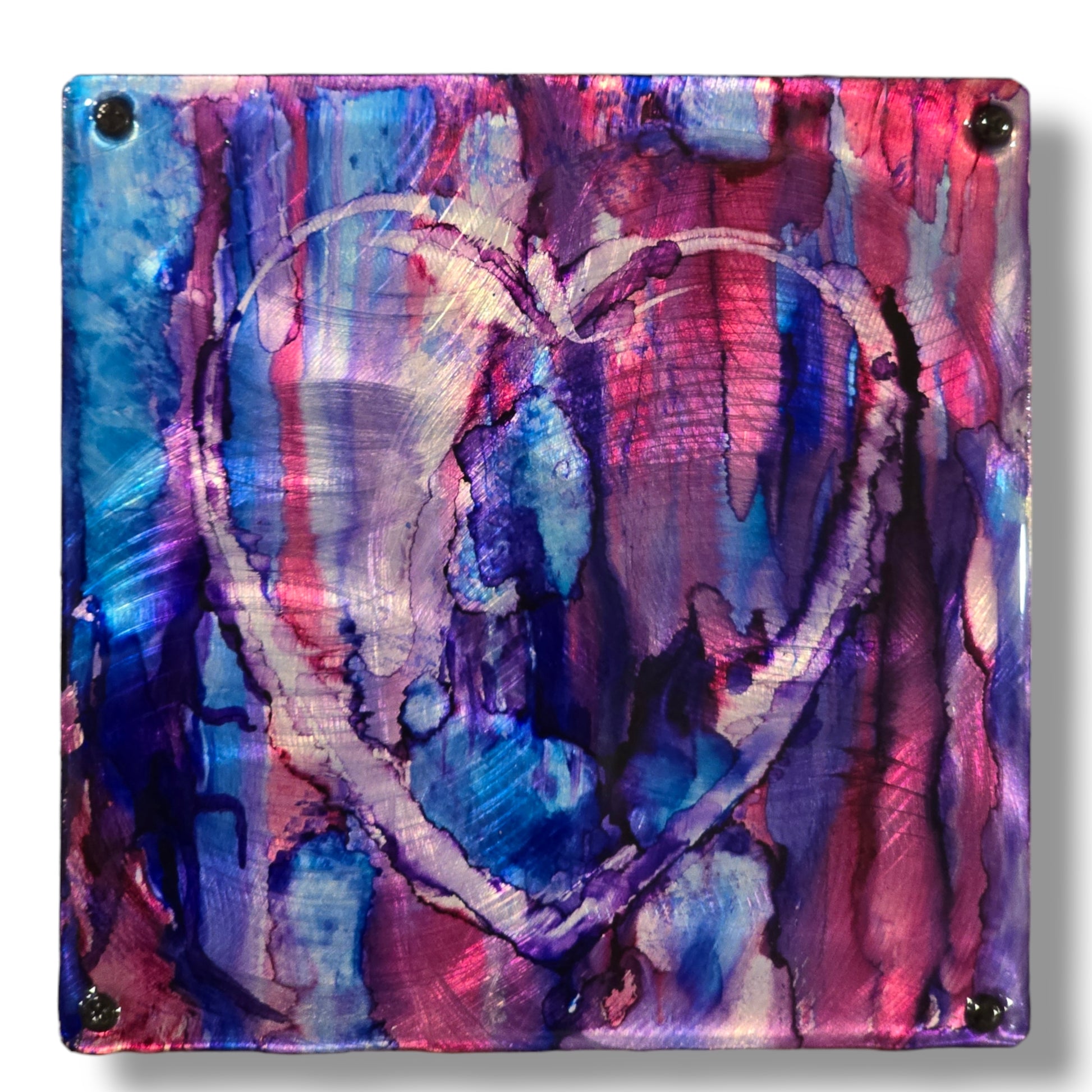 Made with blue and pink alcohol ink on grinded aluminum with resin. Aluminum is screwed to wood panel.