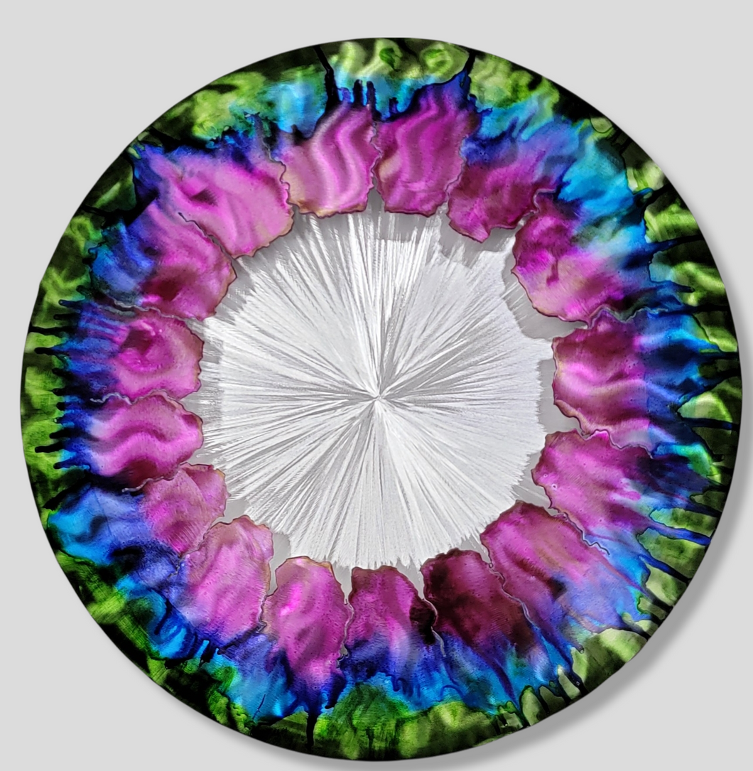 This is made from a recycled aluminum. First, I get the piece sandblasted then cut the design with a plasma cutter then I grind the metal to a smooth finish. Then I cut the backing and add the textures with various grinders. I color the piece using dyes or patinas and get it powdercoated with a clear gloss. The final step is to add the LED lighting.