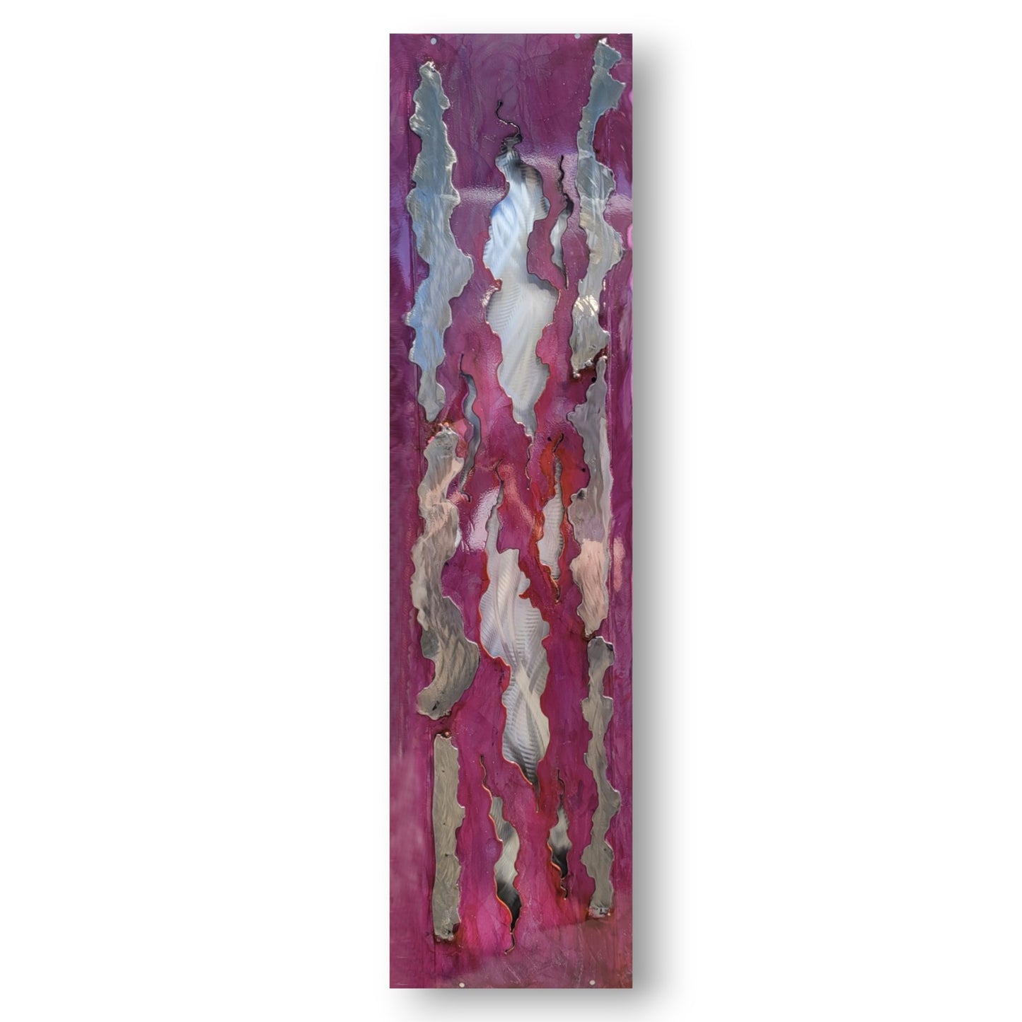 This is made from a recycled metal shelf. First, I get the piece sandblasted then cut the design with a plasma cutter then I grind the metal to a smooth finish. Then I cut the backing and added the textures with various grinders. I color the piece using dyes or patinas and get it powder-coated with a clear gloss. The final step is to add the LED lighting.
