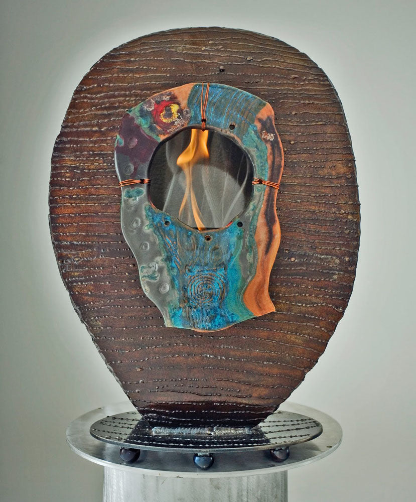 This tabletop fire pit uses alcohol gel fuel as the flame source. This fire pit can be used indoors or outdoors. This is made from a recycled tractor plow blade it is hand cut with a plasma cutter, welded, colored with solvent dye and then powdercoated with a clear coat.