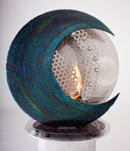 This tabletop fire pit uses alcohol gel fuel as the flame source. It represents the blue moon and the surface of the disc is pitted like the moon. This fire pit can be used indoors or outdoors. This is made from a recycled tractor plow blade it is hand cut with a plasma cutter, welded, colored with solvent dye and then powdercoated with a clear coat.