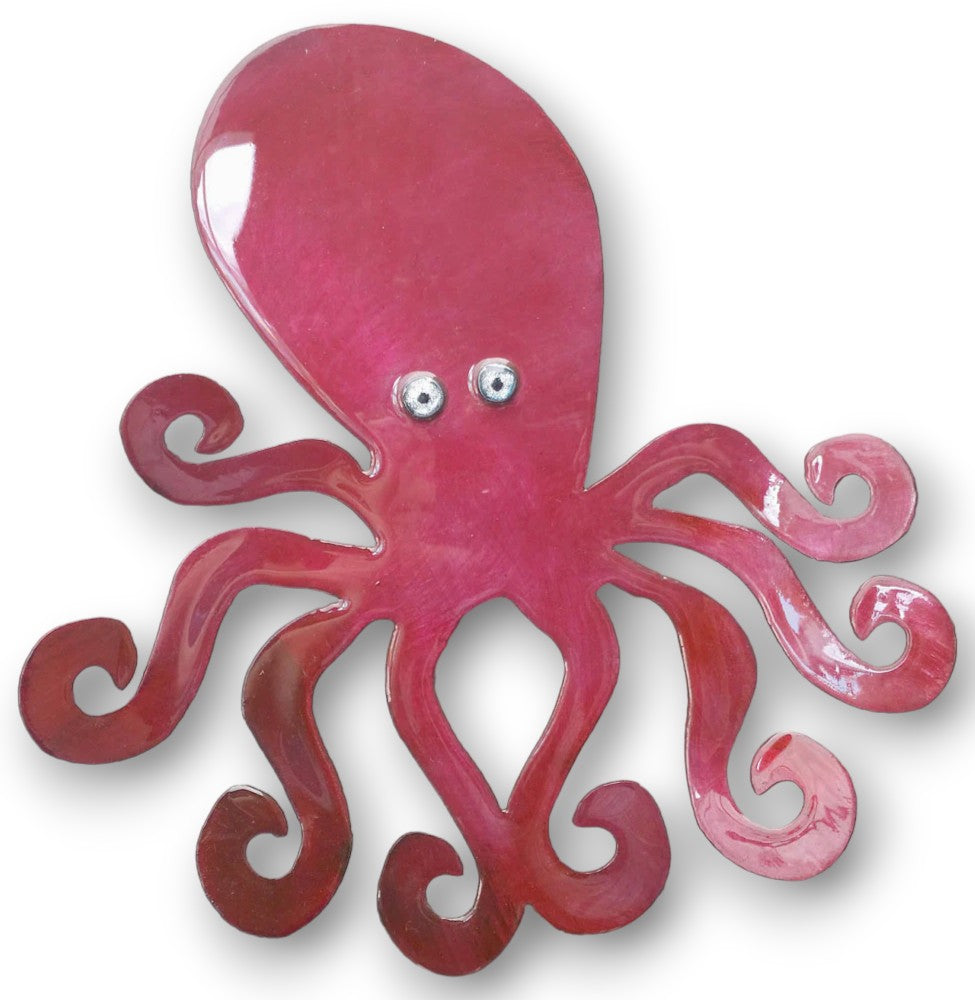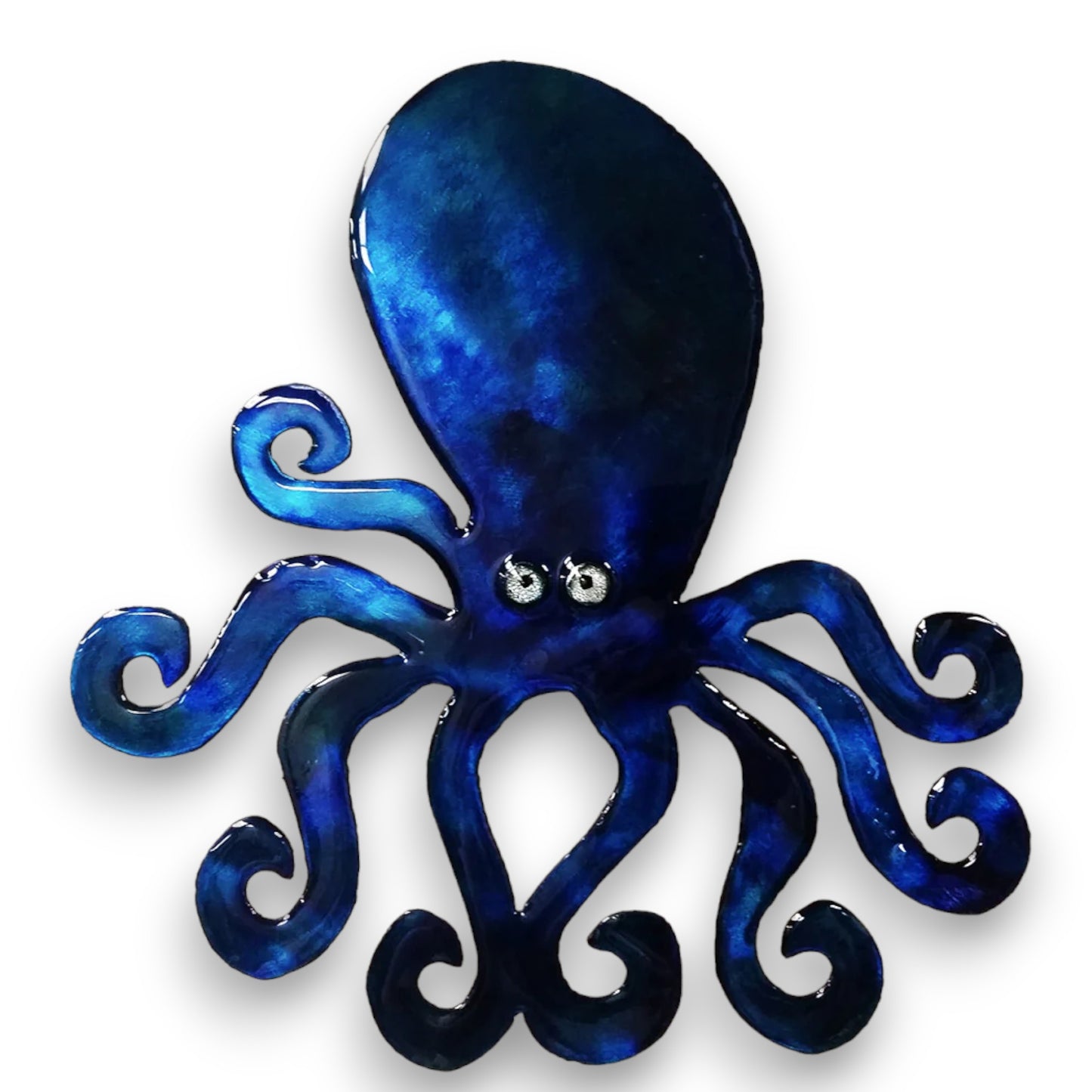 I live up in Northern California and enjoy ocean's beauty. This whimsical piece is created from recycled steel that I hand cut, dye, and coat with resin. The octopus has dichroic glass eyes.
