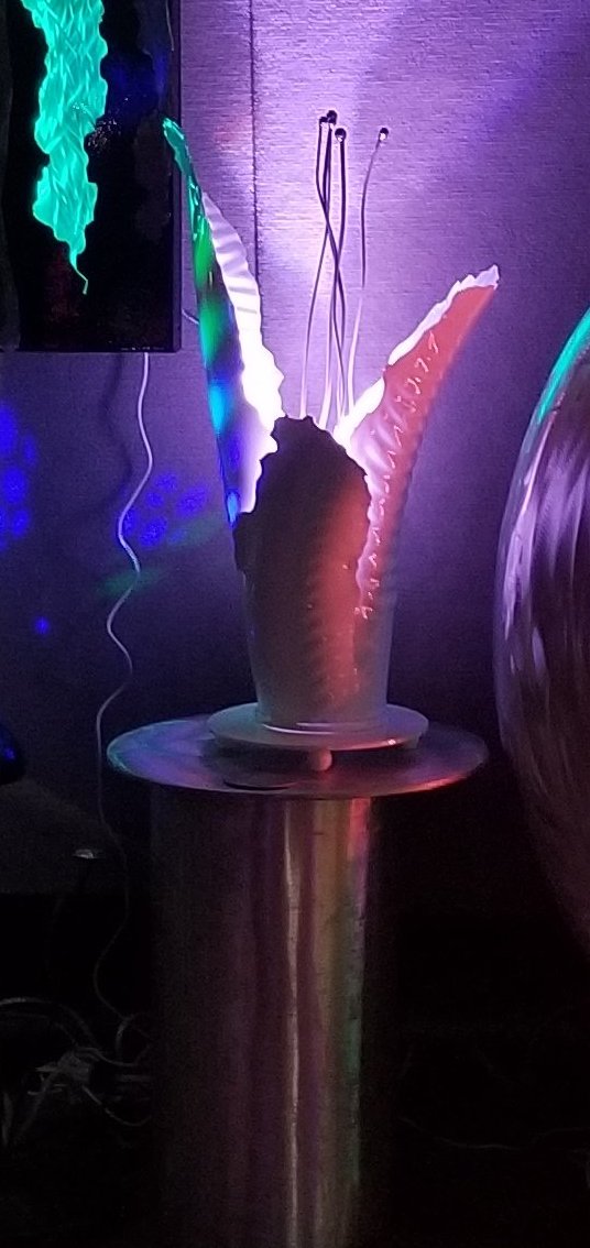 Made from recycled irrigation pipe. Will shine line up to 20 feet on the ceiling. Comes with a remote and can be battery or plug-in.