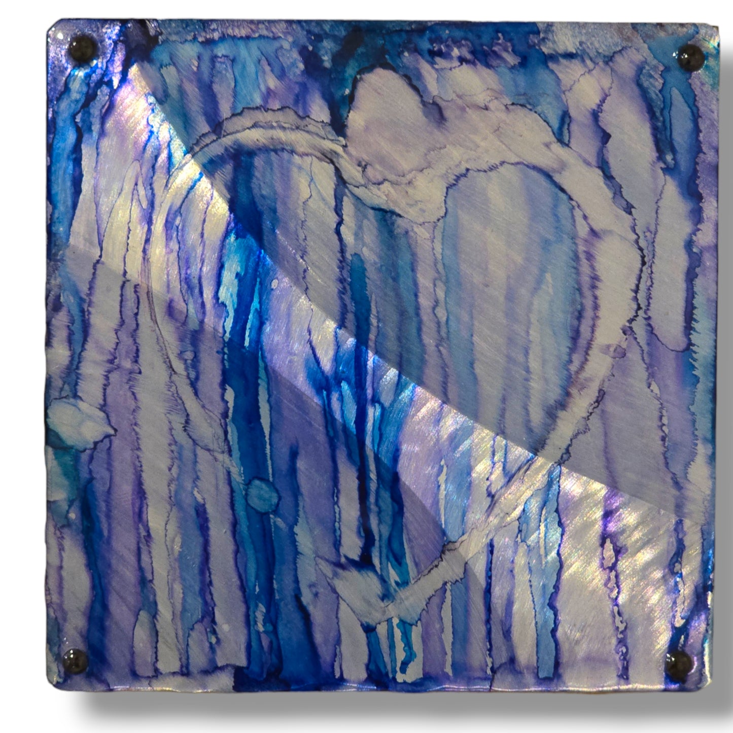 Made with purple and blue alcohol ink on grinded aluminum with resin. Aluminum is screwed to wood panel.