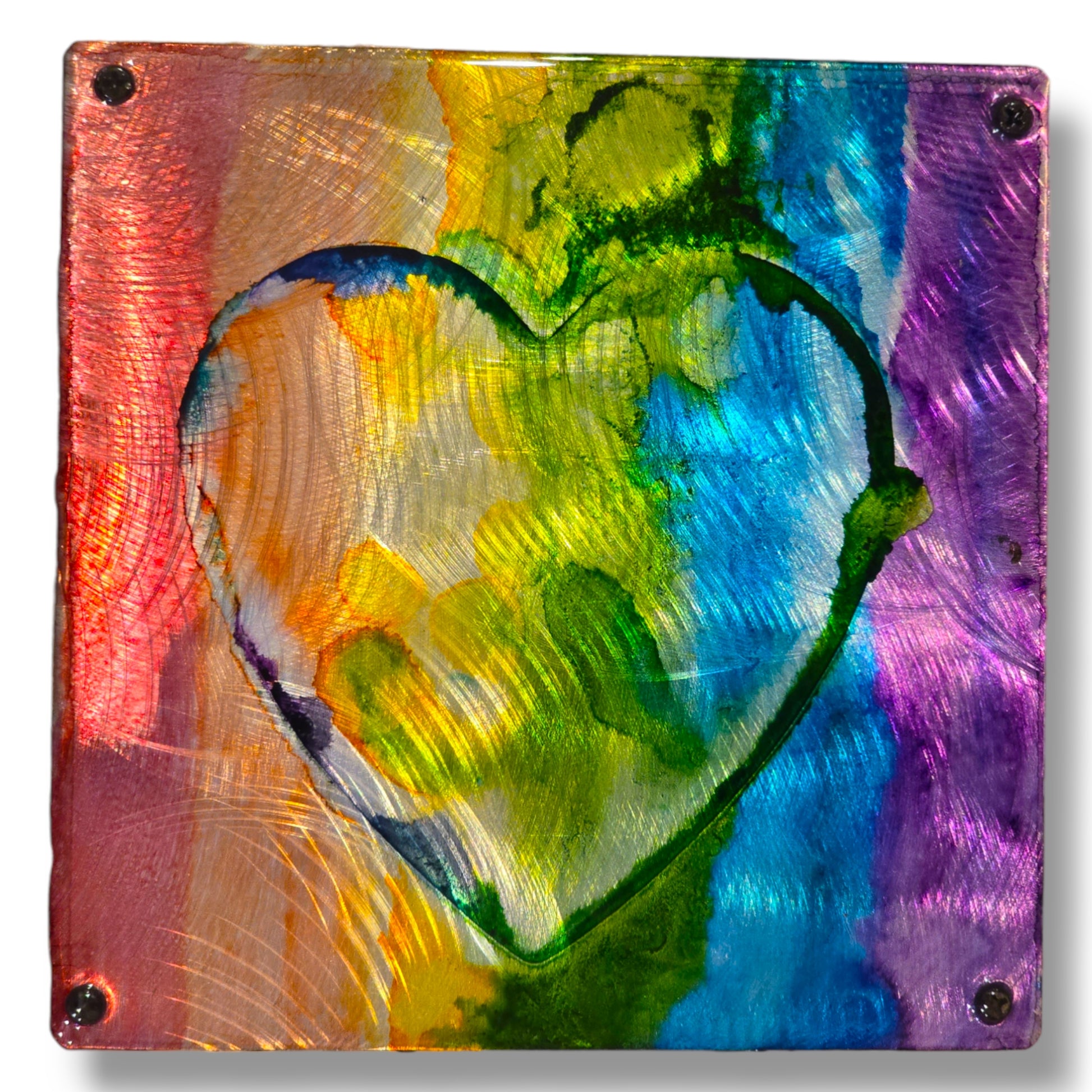 Made with a rainbow of colors in alcohol ink on grinded aluminum with resin. Aluminum is screwed to wood panel.