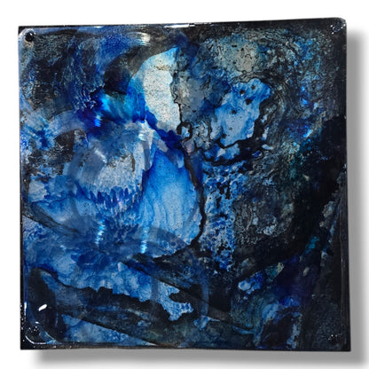 This 12 x 12 piece is made from recycled steel on a 3/4 wood panel. The steel is screwed to the wood panel... the steel as grinded patterns and alcohol ink. It is finished with a UV resin to protect the finish.