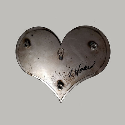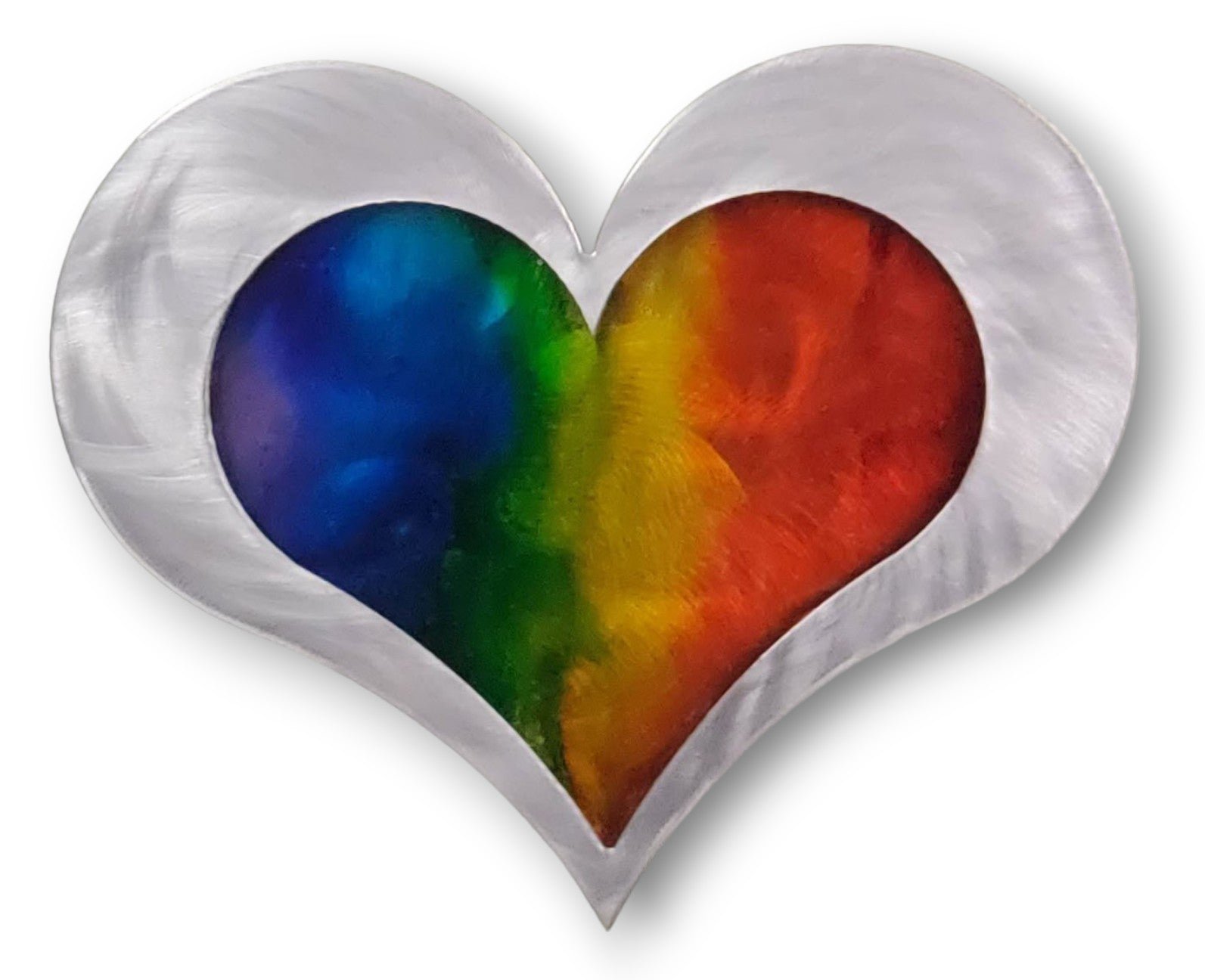 Rainbow love with a different twist. This is recycled steel plasma cut and hand dyed with rainbow colors and a silver finish outline, then finished with resin to create a glass-like finish.