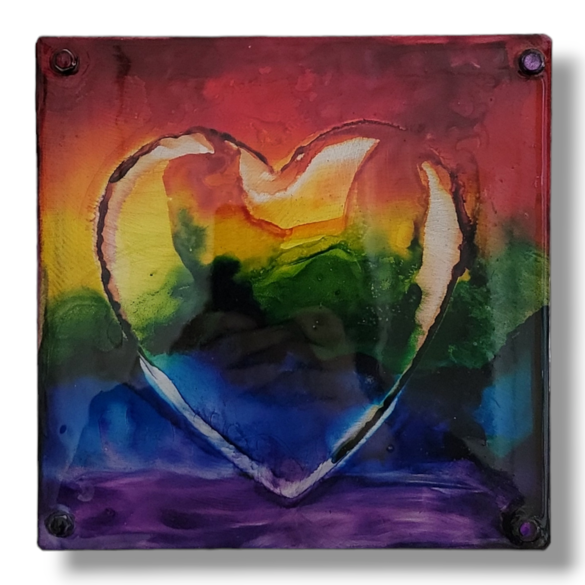 Made with rainbow of colors of alcohol ink on grinded aluminum with resin. Aluminum is screwed to wood panel.